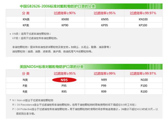 我們既然看到有N95,是不是還有其他型號呢?上面也整理到N95是較低的標(biāo)準(zhǔn),肯定還有較高的標(biāo)準(zhǔn)。NIOSH認(rèn)證的其他防顆粒物口罩級別還包括:N95、N99、N100、R95、R99、R100、P95、P99、P100,一共有9種。N,表示不耐油(not resistant to oil),適合非油性顆粒物;R,表示耐油(resistant to oil),適合油性或非油性顆粒物,若用于油性顆粒物的防護(hù),使用時(shí)間不超過8小時(shí)。P,表示防油(oil proof),適合油性或非油性顆粒物,若用于油性顆粒物,使用時(shí)間應(yīng)遵循制造商的建議。后面的數(shù)字則表示防護(hù)過濾能力。99表示過濾效率在99%以上,100表示過濾效率在99.7%以上。